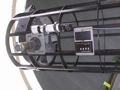auf den Stellrädern verwendet werden (siehe obige Bilder, auf denen das Rad an der Deklinationsachse zwischen Stundenachse und Gegengewichten zu sehen ist). Diese Einstellungsmethode wird jedoch im allgemeinen nicht benutzt, da sie eigentlich zwei Personen erfordert. Um trotzdem auch 'unerfahrenen' Beobachtern die Möglichkeit zu geben, schwächere Objekte aufzufinden, haben wir vor einigen Jahren eine Einstellhilfe namens 'ASTRO-MASTER' von CELESTRON installiert. Dieses Gerät überträgt durch Stellelemente die momentane Richtung des Teleskops auf eine elektronische Anzeige. Somit können beide Richtungsskalen gleichzeitig vom Beobachter abgelesen werden. Durch eine Datenbank mit astronomischen Objekten kann der Beobachter auch zu gewünschten Zielen 'geleitet' werden; zusätzliche Informationen über die Objekte sind ebenfalls abrufbar. Zu Beginn der Beobachtung muß das Gerät lediglich an einem bekannten Stern ausgerichtet werden. Dieses Hilfsmittel ist rechts im Bild zu sehen.